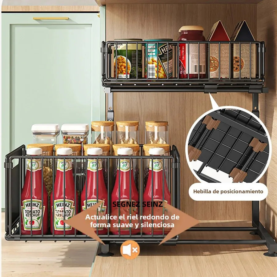 ¡Transforma el caos bajo tu fregadero en un espacio de almacenamiento funcional! Nuestro Organizador Extraíble de 2 Niveles es la solución premium definitiva para maximizar la eficiencia y el espacio en tus gabinetes de cocina y baño. Con un diseño deslizable, nunca más tendrás que rebuscar entre botellas para encontrar lo que necesitas.
