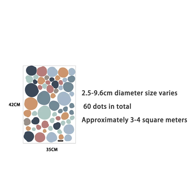 Set de 60 Puntos de Diferentes Tamaños: El paquete incluye 60 lunares con diámetros que varían de 2.5cm a 9.6cm. Esta variedad te permite crear un efecto dinámico y disperso que cubre aproximadamente 3 a 4 metros cuadrados de pared.